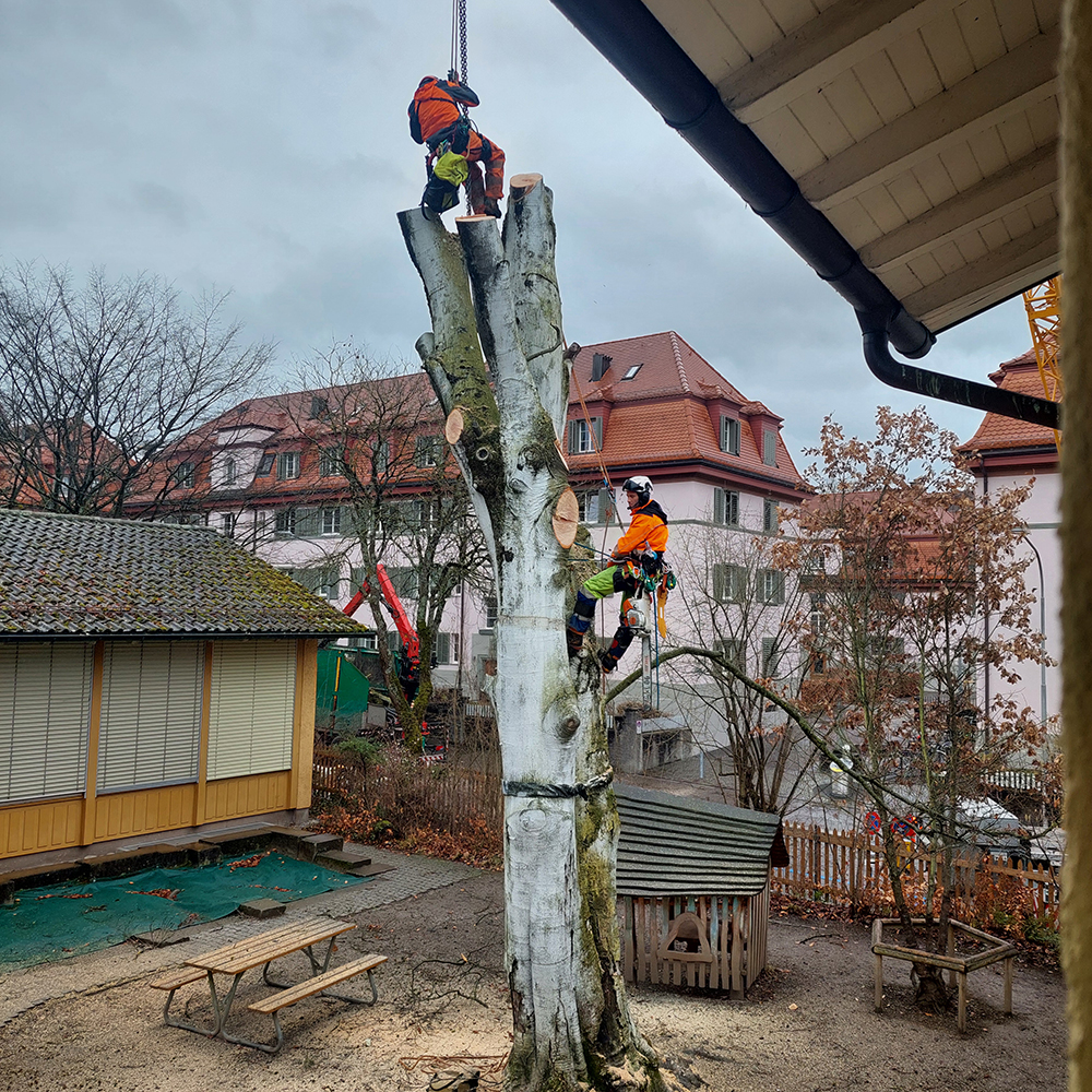 Für die Mitarbeiter:innen mit Sicht auf das Geschehen war es ein eindrücklicher Anblick, wie die Buche mittels eines grossen Krans von angeseilten Baumspezialisten Stück für Stück zersägt und abgetragen wurde. Der Nachfolge-Baum ist bereits gepflanzt und wird im Sommer - wenn auch weit weniger als die rieisge Blutbuche - Schatten spenden.